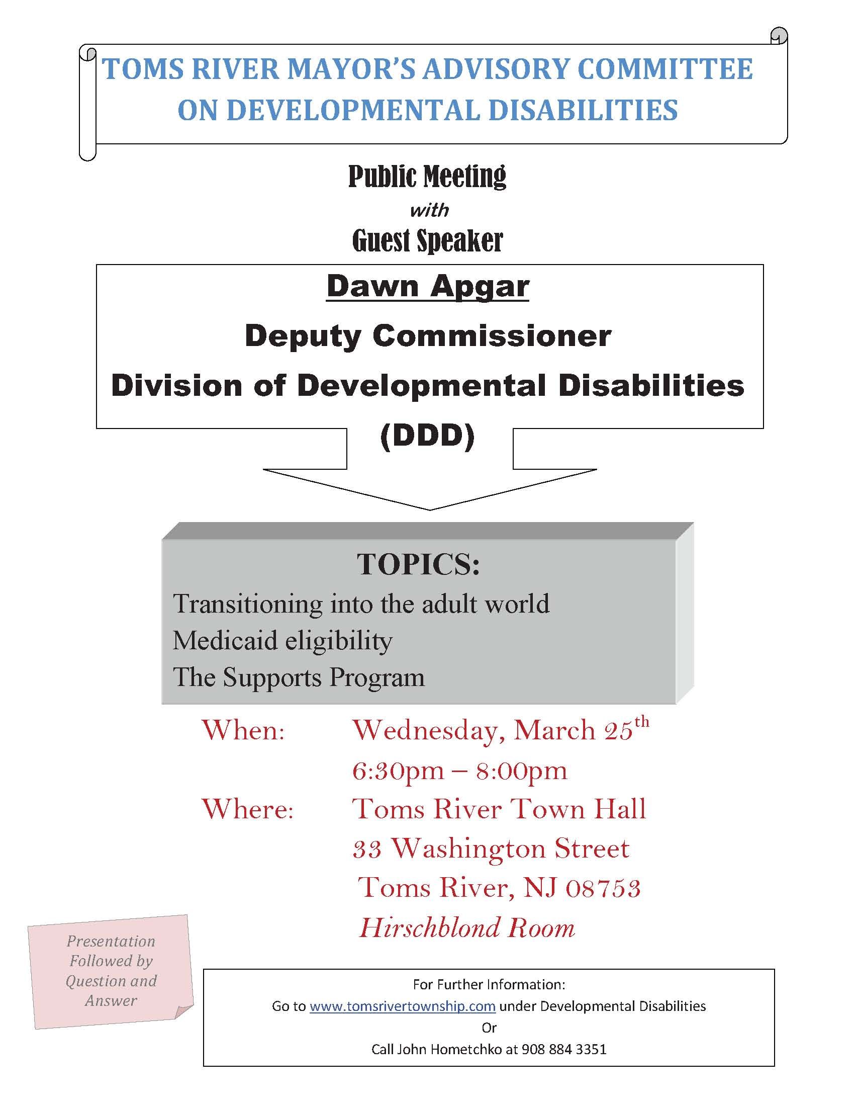 Public Meeting with Guest Speaker: Dawn Apgar, Deputy Commissioner, Division of Developmental Disabilities (DDD)
