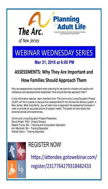 In this informative webinar, team members from The Community Living Education Project (CLEP) will form a panel to discuss how assessments fit into the service delivery system in New Jersey. Most importantly, you will learn how to approach the assessment process in order to provide an accurate picture of support needs. The panel will also share their personal stories and experiences.