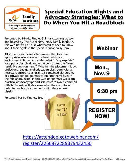 and hosted by The Arc of New Jersey Family Institute, this webinar will discuss what families need to know about their rights in the special education system.