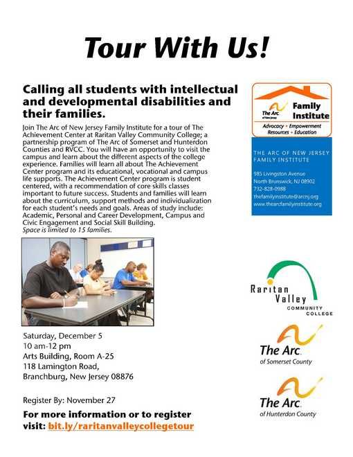Join The Arc of New Jersey Family Institute for a tour of The Achievement Center at Raritan Valley Community College; a partnership program of The Arc of Somerset and Hunterdon Counties and RVCC. You will have an opportunity to visit the campus and learn about the different aspects of the college experience. Families will learn all about The Achievement Center program and its educational, vocational and campus life supports. The Achievement Center program is student centered, with a recommendation of core skills classes important to future success. Students and families will learn about the curriculum, support methods and individualization for each student’s needs and goals. Areas of study include: Academic, Personal and Career Development, Campus and Civic Engagement and Social Skill Building. Space is limited to 15 families.
