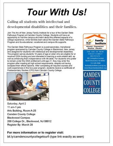 Join The Arc of New Jersey Family Institute for a tour of the Garden State Pathways Program at Camden County College. Students will have an opportunity to visit the campus and learn about the different aspects of a college experience, while families learn about the Garden State Pathways Program and its educational, vocational and campus life supports.