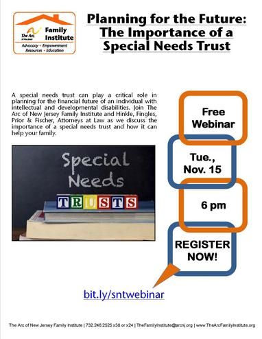 A special needs trust can play a critical role in planning for the financial future of an individual with intellectual and developmental disabilities. Join The Arc of New Jersey Family Institute and Hinkle, Fingles, Prior & Fischer, Attorneys at Law as we discuss the importance of a special needs trust and how it can help your family.