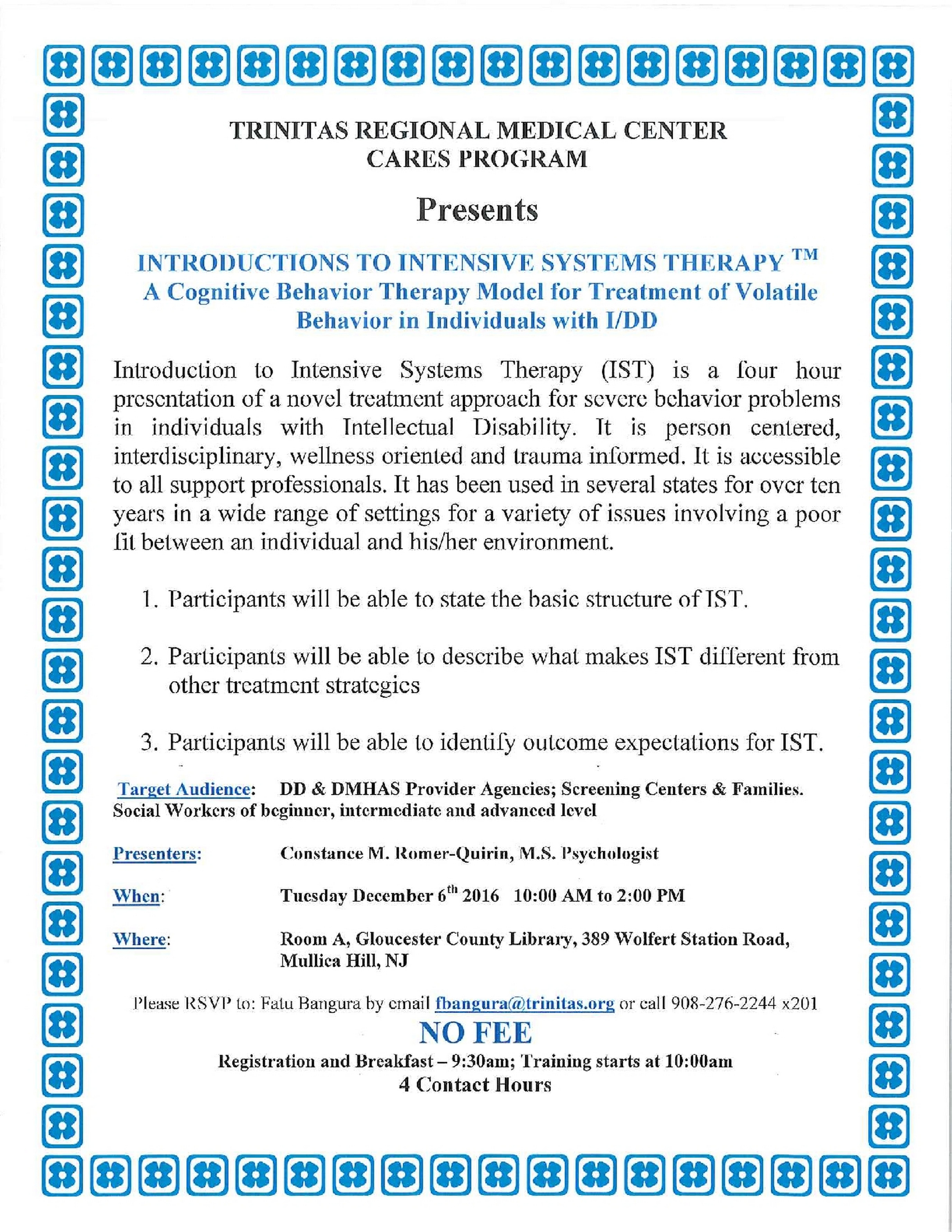 lease see below and the attachment for information on a free training provided by the Trinitas Regional Medical Center's CARES program: Introduction to Intensive Systems Therapy, a cognitive behavior therapy model for treatment of volatile behavior in individuals with I/DD. The training will be held on Tuesday, Dec. 6th from 10 am to 2 pm at the Gloucester County Library. Social workers will receive 4 Contact Hours.