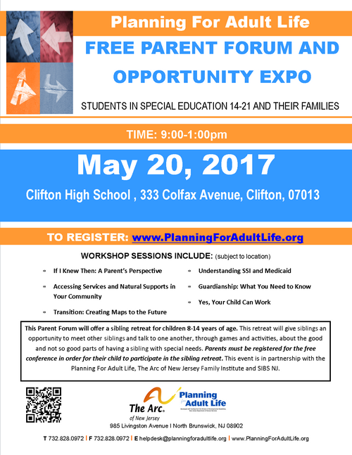 This Parent Forum will offer a sibling retreat for children 8-14 years of age. This retreat will give siblings an opportunity to meet other siblings and talk to one another, through games and activities, about the good and not so good parts of having a sibling with special needs. Parents must be registered for this free conference in order for their child to participate in the sibling retreat. This event is in partnership with the Planning For Adult Life, The Arc of New Jersey Family Institute and SIBS NJ.
