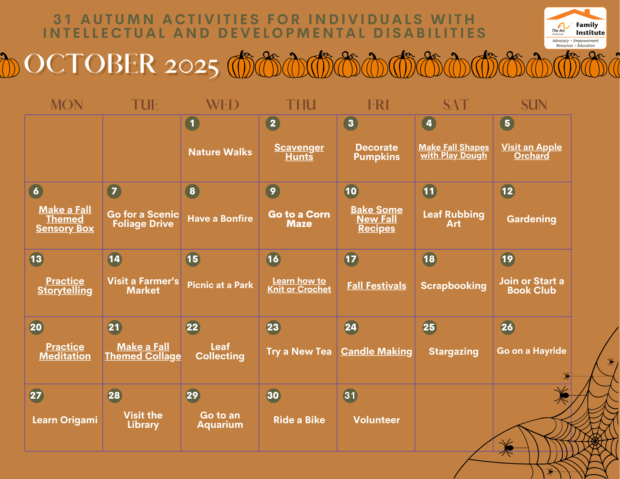 FI Calendar for October 2025 - 31 Autumn Activities For Individuals with Intellectual and Developmental Disabilities
